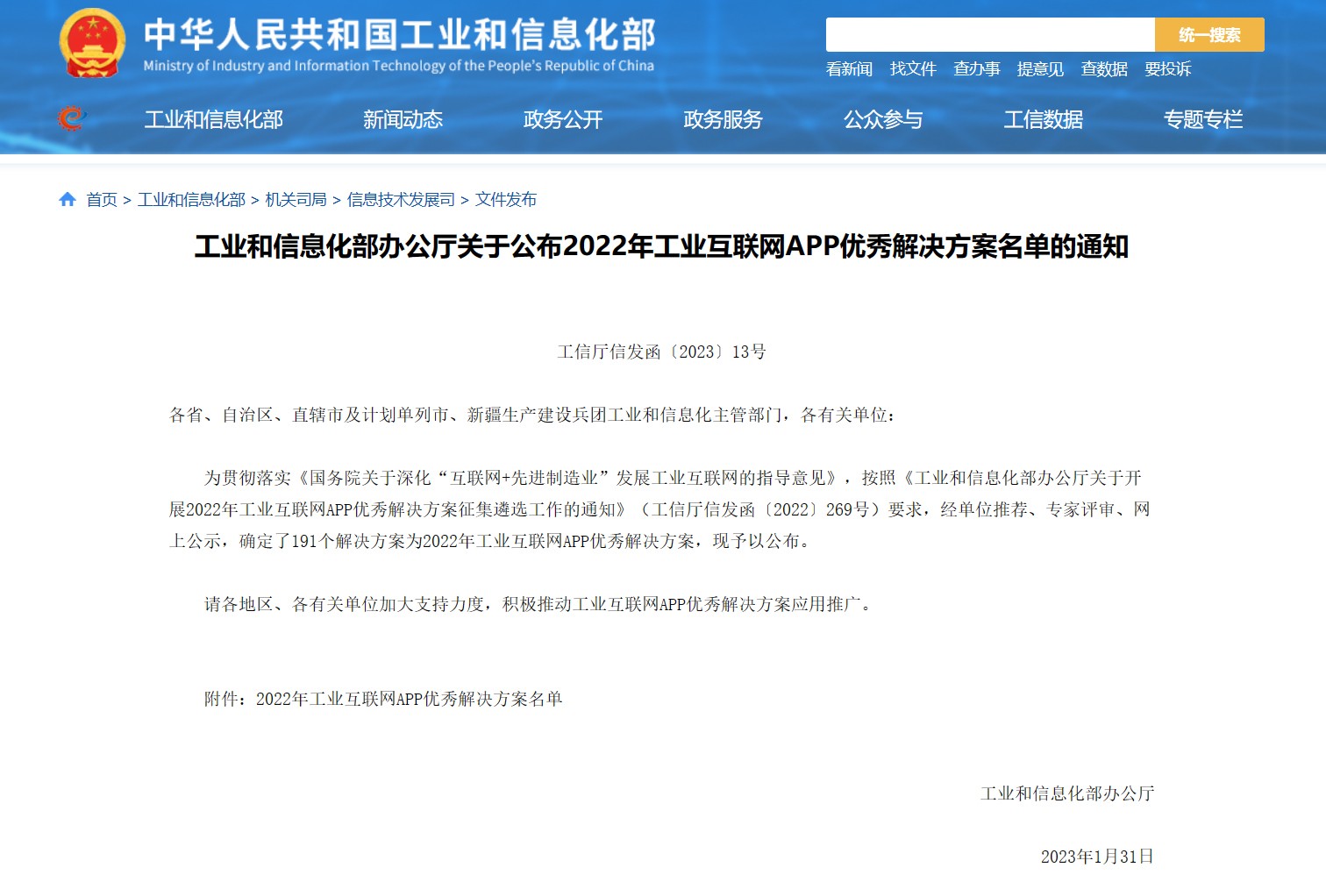 2023年1月20日,,,工业和信息化部公布了《2022年工业互联网APP优秀解决方案名单》,,AG尊龙科技 “面向通用机械的能碳安一体化工业服务应用解决方案”(以下简称“能碳安”)成功入选。。。
