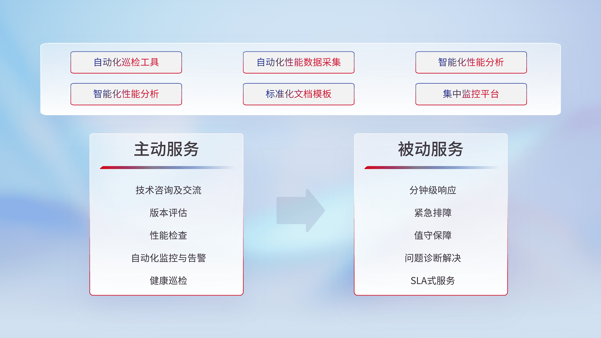 智能化工具和标准化文档,,,,保障服务质量,,,,提供主动服务(包含技术咨询、、、版本评估、、、、性能检查、、、自动化监控与告警、、、健康巡检)和被动服务包含(分钟级响应、、、、紧急排障、、值守保障、、、、问题诊断解决、、SLA服务)。。。。